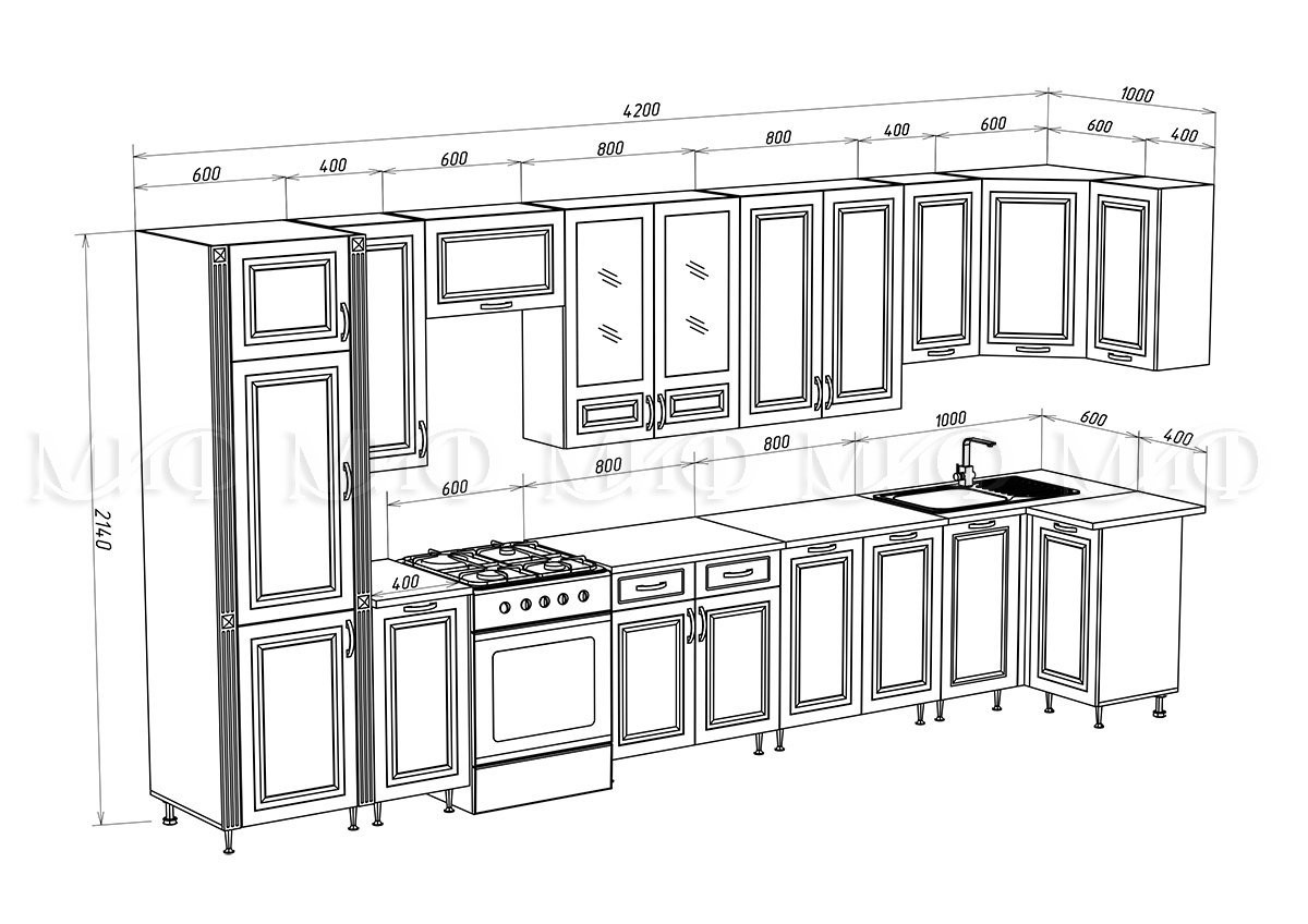 • Ширина 1000  х 4200 мм (мм)  x Глубина 600 по столешнице/корпус 450 (мм)  х Высота 830 (мм)